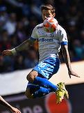 Российская Премьер-Лига (РПЛ). МИР - Чемпионат России по футболу 2022/2023. 29-й тур. Матч между командами "Динамо" (Москва) - "Локомотив" (Москва) на стадионе "ВТБ Арена" - Центральный стадион "Динамо" имени Льва Яшина. Игрок команды "Динамо" Федор Смолов (слева) и игрок команды "Локомотив" Наир Тикнизян (в центре) во время матча.