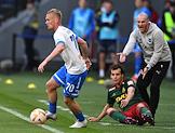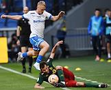 Российская Премьер-Лига (РПЛ). МИР - Чемпионат России по футболу 2022/2023. 29-й тур. Матч между командами "Динамо" (Москва) - "Локомотив" (Москва) на стадионе "ВТБ Арена" - Центральный стадион "Динамо" имени Льва Яшина. Игрок команды "Динамо" Матиас Норманн (слева) и игрок команды "Локомотив" Антон Миранчук (справа) во время матча.