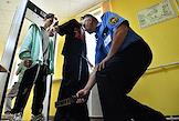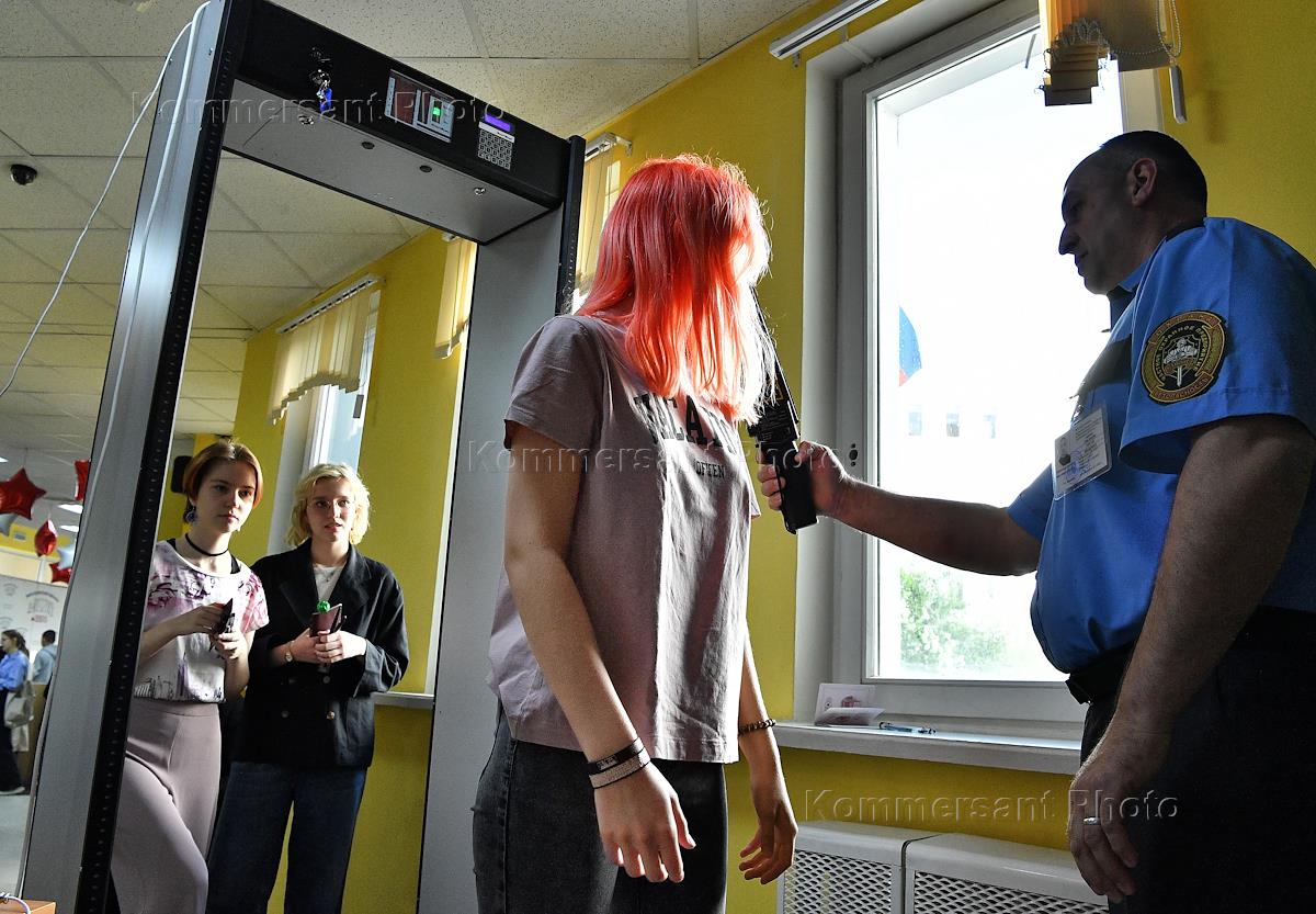 Проведение Единого Государственного Экзамена (ЕГЭ) по русскому языку в Государственном бюджетном общеобразовательном учреждении города Москвы "Школа № 1284" в Уланском переулке. Выпускники на входе в здание школы проходят металлоискатель.