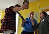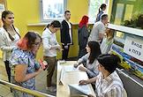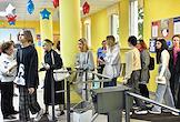 Проведение Единого Государственного Экзамена (ЕГЭ) по русскому языку в Государственном бюджетном общеобразовательном учреждении города Москвы "Школа № 1284" в Уланском переулке. Выпускники перед началом экзамена на регистрации.