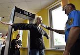 Проведение Единого Государственного Экзамена (ЕГЭ) по русскому языку в Государственном бюджетном общеобразовательном учреждении города Москвы "Школа № 1284" в Уланском переулке. Выпускник на входе в здание школы проходят металлоискатель.