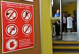 Проведение Единого Государственного Экзамена (ЕГЭ) по русскому языку в Государственном бюджетном общеобразовательном учреждении города Москвы "Школа № 1284" в Уланском переулке. Жанровая фотография. Информационный стенд для выпускников о правилах и предметах, взятых с собой на экзамен.