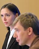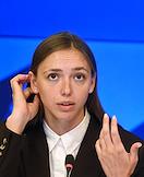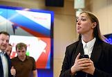 Пресс-конференция, посвященная проведению Фестиваля "Движения Первых" во всех субъектах Российской Федерации в МИА "Россия сегодня". Руководитель Федерального агентства России по делам молодежи Ксения Разуваева (слева) во время пресс-конференции.
