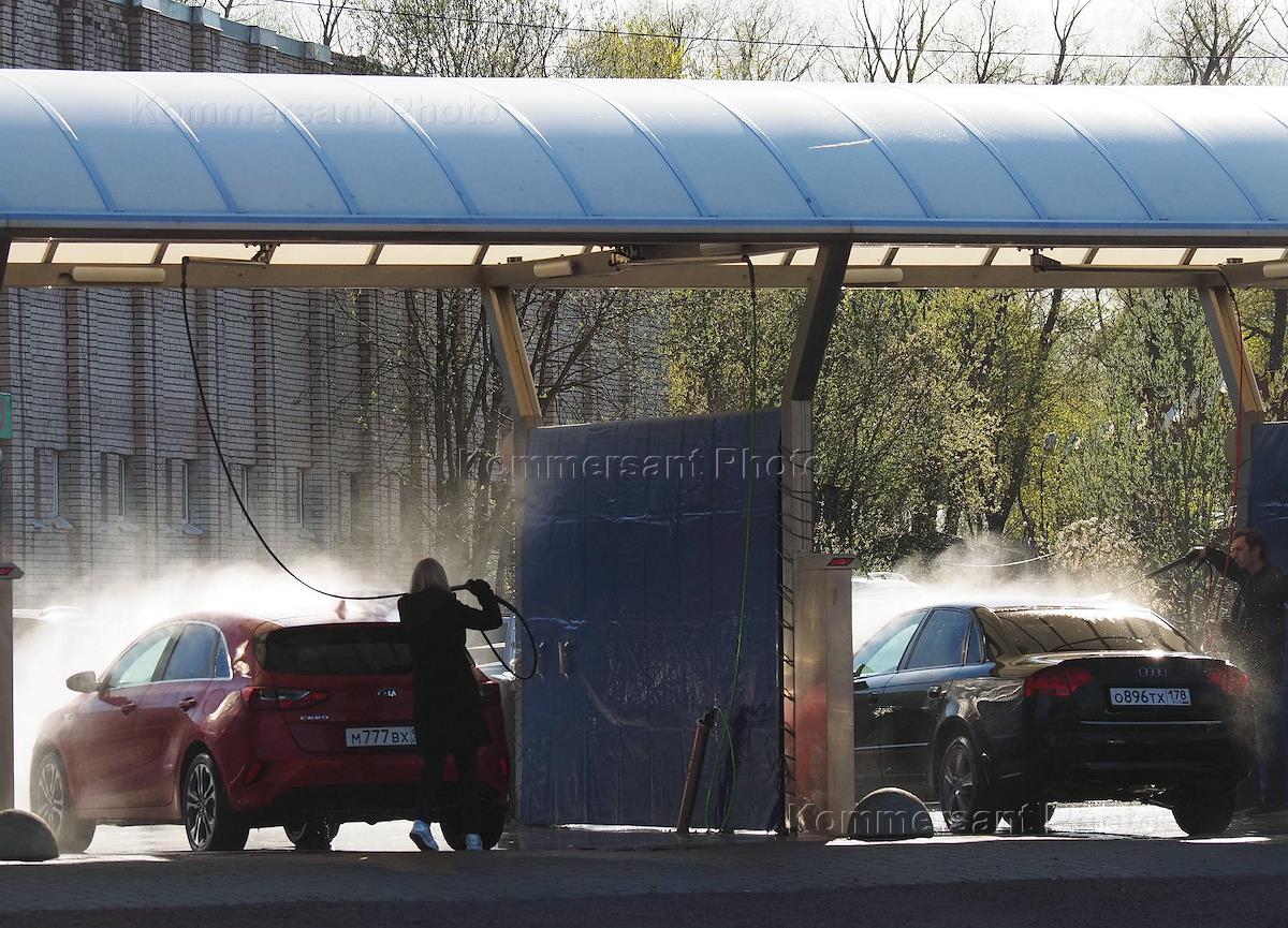 Виды Царского Села. Жанровая фотография. Люди моют свои автомобили на мойке самообслуживания.