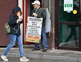 Жанровая фотография. Мужчина с рекламной панелью (живая реклама или (промо-сэндвич) на улице.