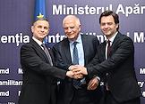 Пресс-конференция Верховного представителя Евросоюза по иностранным делам и политике безопасности Жозепе Борреля, министра министерства обороны Молдавии Анатолия Носатого и вице-премьера и министра иностранных дел и европейской интеграции Республики Молдова Нику Попеску, после передачи партии оборудования для подразделений саперов и службы медицинской помощи армии Молдовы. Слева направо, первый ряд: министр иностранных дел и европейской интеграции Республики Молдова Нику Попеску, верховный представитель Евросоюза по иностранным делам и политике безопасности Жозеп Боррель и министр обороны Республики Молдова Анатолий Носатый после окончания пресс-конференции.