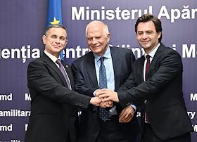 Пресс-конференция Верховного представителя Евросоюза по иностранным делам и политике безопасности Жозепе Борреля, министра министерства обороны Молдавии Анатолия Носатого и вице-премьера и министра иностранных дел и европейской интеграции Республики Молдова Нику Попеску, после передачи партии оборудования для подразделений саперов и службы медицинской помощи армии Молдовы. Слева направо: министр обороны Республики Молдова Анатолий Носатый, верховный представитель Евросоюза по иностранным делам и политике безопасности Жозеп Боррель и вице-премьер и министр иностранных дел и европейской интеграции Республики Молдова Нику Попеску во время пресс-конференции.
