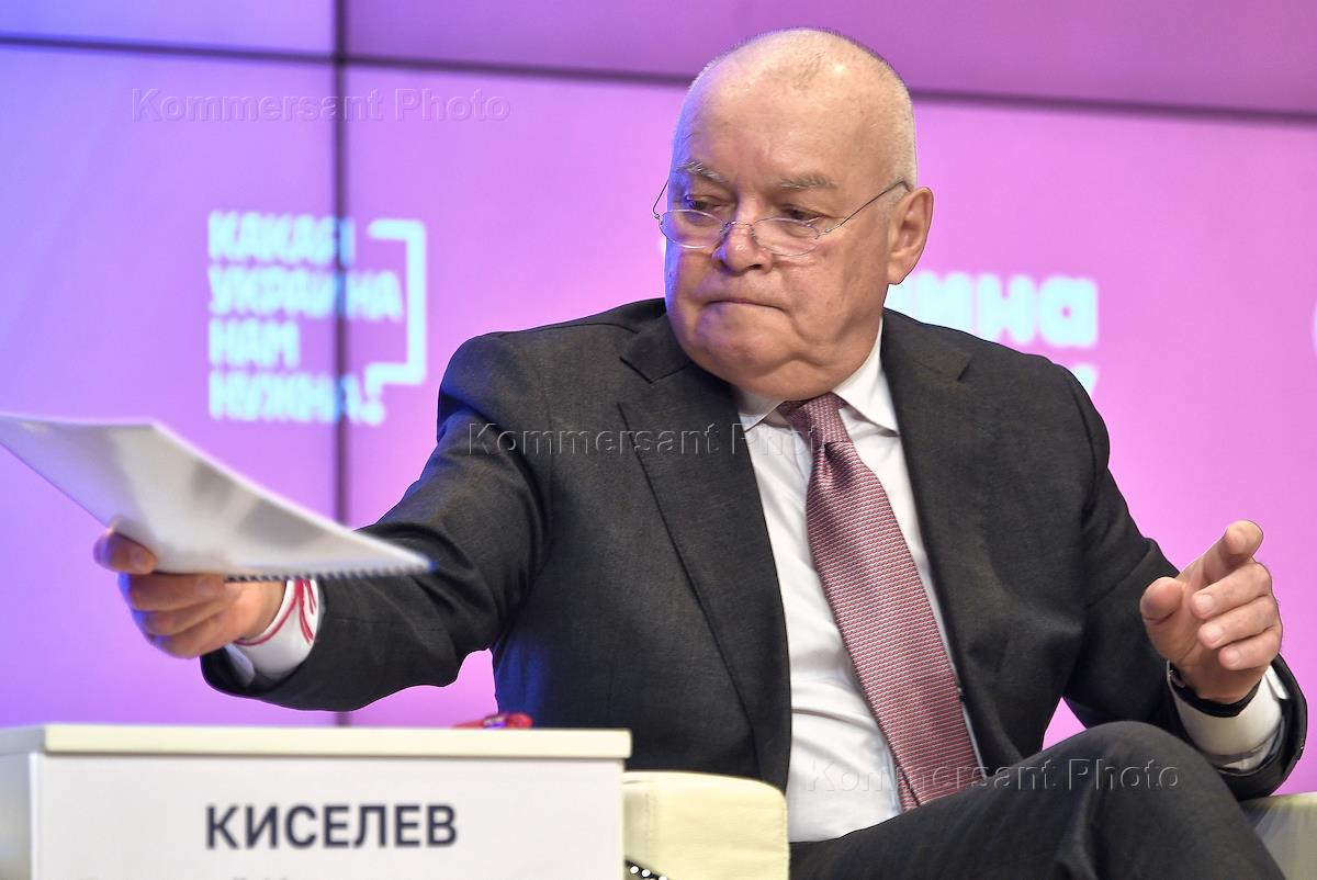 Панельная дискуссия "Кризис миропорядка и Украина" в рамках форума "Какая Украина нам нужна?" в Международном мультимедийном пресс-центре "Россия сегодня". Телеведущий, генеральный директор информагентства "Россия сегодня" Дмитрий Киселев во время дискуссии.