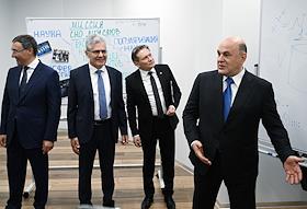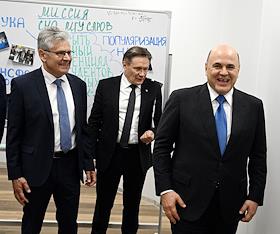 Рабочая поездка председателя правительства России Михаила Мишустина в Саров. Председатель Правительства России Михаил Мишустин (второй справа) во время осмотра учебных корпусов филиала МГУ имени М.В. Ломоносова.