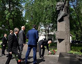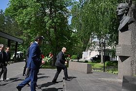 Рабочая поездка председателя правительства России Михаила Мишустина в Саров. Председатель Правительства России Михаил Мишустин (справа) во время церемонии возложения цветов к памятнику первому научному руководителю Российского федерального ядерного центра – Всероссийского Научно-исследовательского института экспериментальной физики (РФЯЦ-ВНИИЭФ) Юлию Харитону.