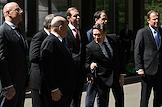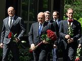 Рабочая поездка председателя правительства России Михаила Мишустина в Саров. Председатель Правительства России Михаил Мишустин (в центре), заместитель председателя Правительства России Дмитрий Чернышенко (слева), заместитель председателя Правительства России - министр промышленности и торговли России Денис Мантуров (четвертый справа) и генеральный директор госкорпорации "Росатом" Алексей Лихачев (третий справа) после церемонии возложения цветов к памятнику первому научному руководителю Российского федерального ядерного центра – Всероссийского Научно-исследовательского института экспериментальной физики (РФЯЦ-ВНИИЭФ) Юлию Харитону.