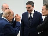 Рабочая поездка председателя правительства России Михаила Мишустина в Саров. Председатель Правительства России Михаил Мишустин (третий слева), ректор МГУ имени М.В. Ломоносова Виктор Садовничий (в центре) и руководитель Национального центра физики и математики, академик РАН Александр Сергеев (справа) во время осмотра учебных корпусов филиала МГУ имени М.В. Ломоносова.