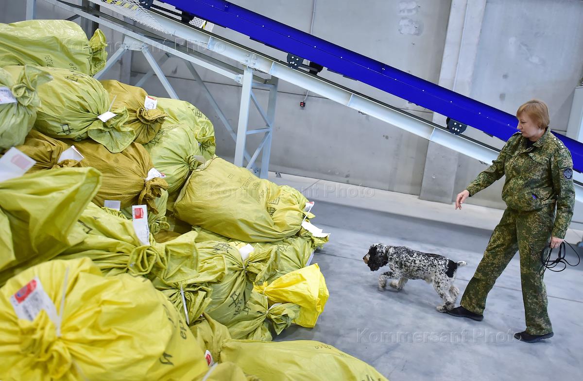 Работа таможенного поста Центральной почтовой таможни в Новосибирском логистическом почтовом центре. Жанровая фотография. Кинолог со служебной собакой во время проверки груза.