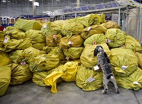 Работа таможенного поста Центральной почтовой таможни в Новосибирском логистическом почтовом центре. Жанровая фотография. Служебная собака во время проверки груза.