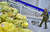 Работа таможенного поста Центральной почтовой таможни в Новосибирском логистическом почтовом центре. Жанровая фотография. Кинолог со служебной собакой во время проверки груза.