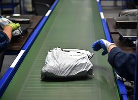 Работа Новосибирского логистического почтового центра. Обработка международных почтовых отправлений на почтовом таможенном посту Центральной почтовой таможни. Жанровая фотография. Почтовое отправление на конвейере.