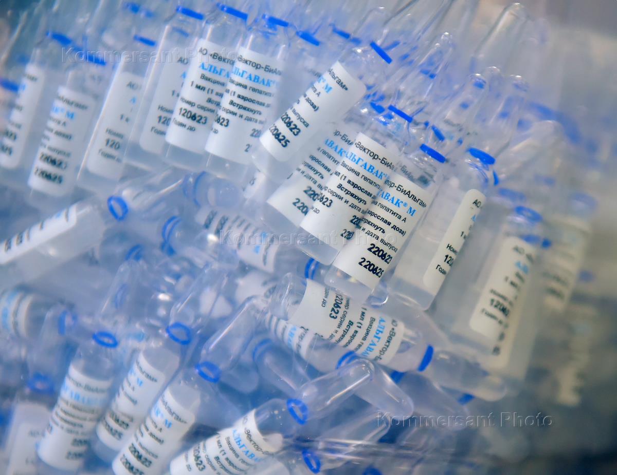 Производство вакцин на предприятии АО "Вектор-БиАльгам" в наукограде Кольцово Новосибирской области. Ампулы с вакциной "Альгавак" для профилактики вирусного гепатита А.