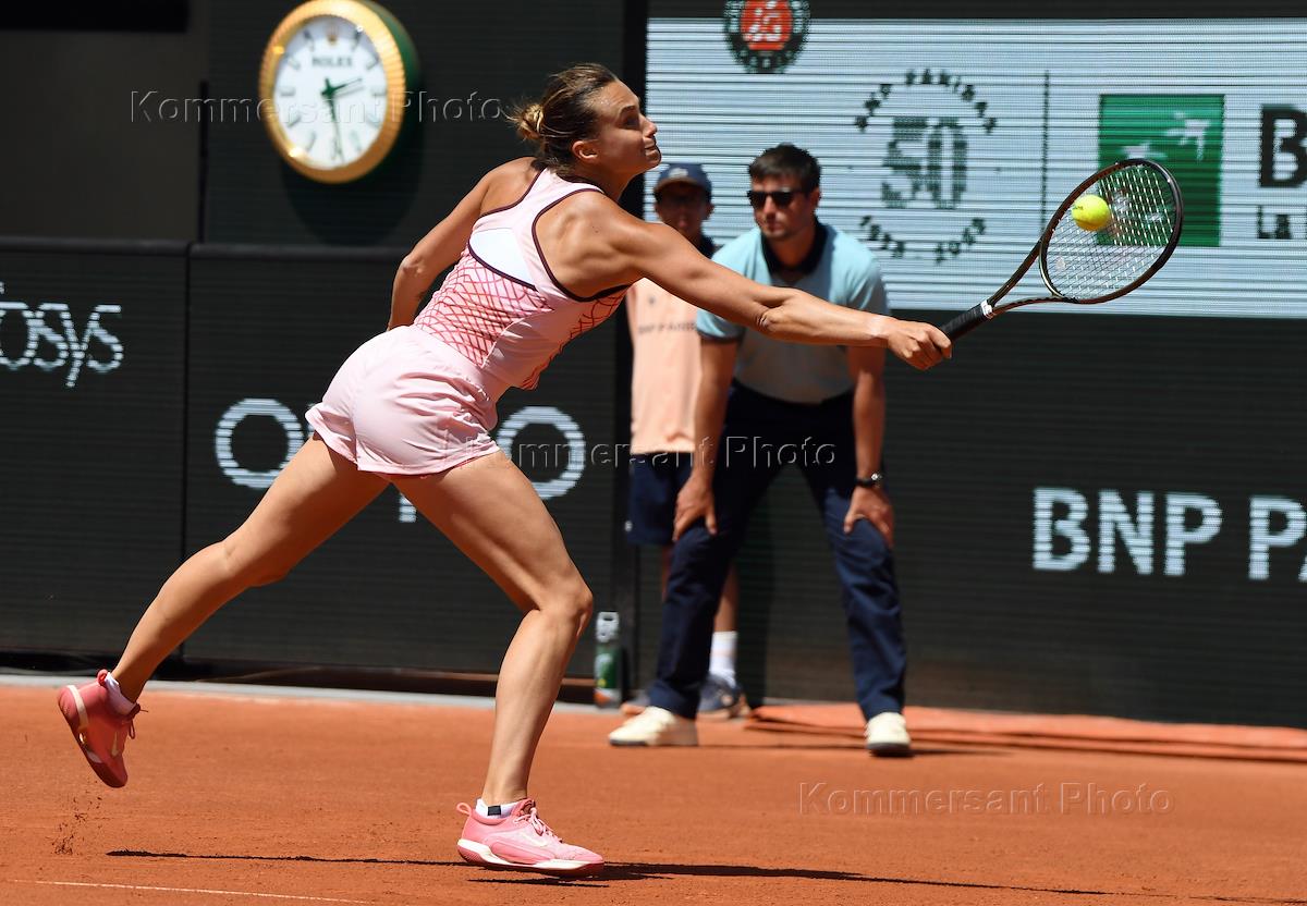 Открытый чемпионат Франции по теннису "Ролан Гаррос-2023" (Roland Garros). Белорусская теннисистка Арина Соболенко во время матча с российской теннисисткой Камиллой Рахимовой.