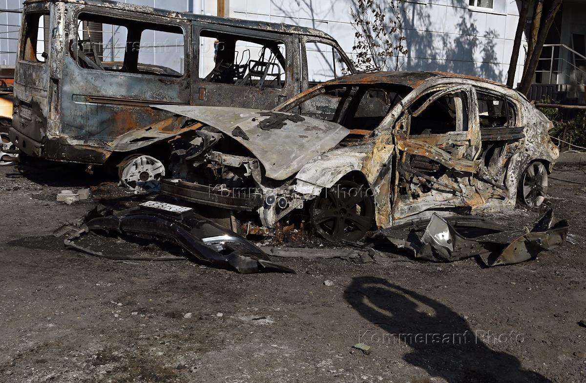 Ситуация в Белгородской области во время проведения специальной военной операции Вооруженных Сил России на Украине. Жанровая фотография. Сгоревшие автомобили со следами после обстрела на стоянке.