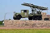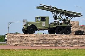Ситуация в Белгородской области во время проведения специальной военной операции Вооруженных Сил России на Украине. Жанровая фотография. Бесствольная система полевой реактивной артиллерии БМ-13 "Катюша" времен Великой Отечественной войны, на постаменте на въезде в город.