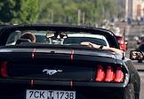 Ситуация в Белгородской области во время проведения специальной военной операции Вооруженных Сил России на Украине. Жанровая фотография. Молодые люди едут на автомобили кабриолет "Мустанг" на улице города.