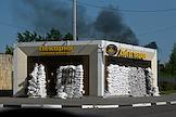 Ситуация в Белгородской области во время проведения специальной военной операции Вооруженных Сил России на Украине. Жанровая фотография. Дым от пожара после обстрела. Мешки с песком у здания пекарни "Хлеб из тандыра".