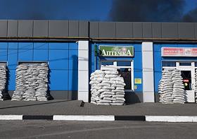 Ситуация в Белгородской области во время проведения специальной военной операции Вооруженных Сил России на Украине. Жанровая фотография. Дым от пожара после обстрела. Мешки с песком у здания аптеки и магазина продуктов.