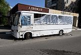 Ситуация в Белгородской области во время проведения специальной военной операции Вооруженных Сил России на Украине. Жанровая фотография. Пассажирский автобус с табличкой "Родина" на улице города.