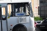 Ситуация в Белгородской области во время проведения специальной военной операции Вооруженных Сил России на Украине. Жанровая фотография. Пассажирский автобус с табличкой "Родина" на улице города.