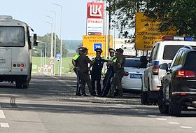Ситуация в Белгородской области во время проведения специальной военной операции Вооруженных Сил России на Украине. Жанровая фотография. Сотрудники ДПС полиции во время патрулирования въезд в город.