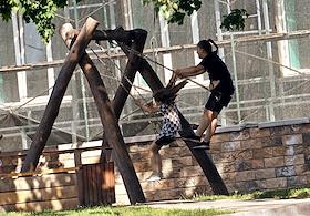 Ситуация в Белгородской области во время проведения специальной военной операции Вооруженных Сил России на Украине. Жанровая фотография. Дети катаются на качелях на улице города.