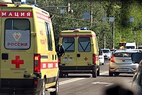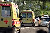 Ситуация в Белгородской области во время проведения специальной военной операции Вооруженных Сил России на Украине. Жанровая фотография. Автомобили реанимации скорой медицинской помощи с буква "Z" и "V" на заднем стекле на трассе в городе.