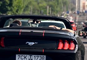 Ситуация в Белгородской области во время проведения специальной военной операции Вооруженных Сил России на Украине. Жанровая фотография. Молодые люди едут на автомобили кабриолет "Мустанг" на улице города.
