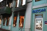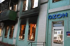 Ситуация в Белгородской области во время проведения специальной военной операции Вооруженных Сил России на Украине. Жанровая фотография. Пожар в жилом доме после обстрела. Вход в пункт выдачи маркетплейса "Озон".