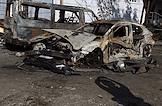 Ситуация в Белгородской области во время проведения специальной военной операции Вооруженных Сил России на Украине. Жанровая фотография. Сгоревшие автомобили со следами после обстрела на стоянке.