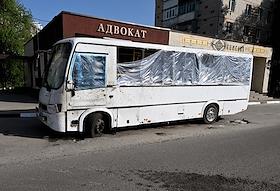 Ситуация в Белгородской области во время проведения специальной военной операции Вооруженных Сил России на Украине. Жанровая фотография. Городской пассажирский автобус со следами после обстрела на улице города.