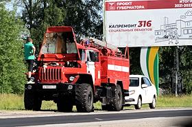 Ситуация в Белгородской области во время проведения специальной военной операции Вооруженных Сил России на Украине. Жанровая фотография. Автомобиль пожарной службы с открытым капотом на трассе в городе.