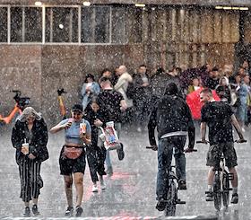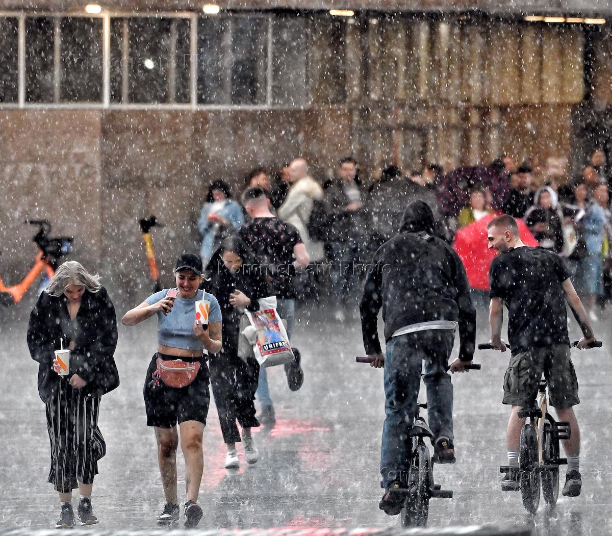 Виды Москвы. Жанровая фотография. Прохожие на улице во время сильного дождя.