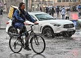 Виды Москвы. Жанровая фотография. Курьер службы доставки еды на велосипеде во время сильного дождя.