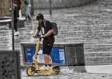 Виды Москвы. Жанровая фотография. Мужчина катается на электро-самокате во время сильного дождя.