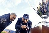Футбольный матч 2-й лиги между командами "Ленинградец" (Ленинградская область) и "Спартак" (Кострома) на стадионе "Петровский". Команда "Ленинградец" во время церемонии награждения. Губернатор Ленинградской области - председатель правительства Ленинградской области Александр Дрозденко (в центре) и член совета директоров Группы ЛСР, генеральный директор Футбольного клуба "Ленинградец" Игорь Левит (справа) на трибуне во время матча.