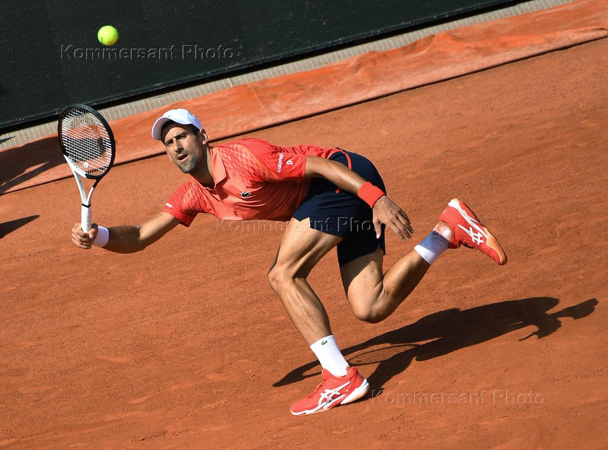 Открытый чемпионат Франции по теннису "Ролан Гаррос-2023" (Roland Garros). 1/4 финала. Сербский теннисист Новак Джокович во время матча с российским теннисистом Кареном Хачановым.