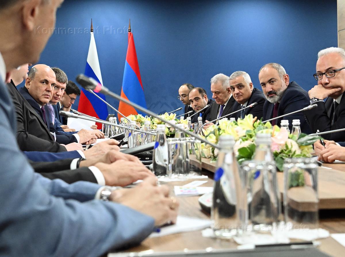 Working trip of Russian Prime Minister Mikhail Mishustin to Sochi. Armenian Prime Minister Nikol Pashinyan (right) and Armenian Deputy Prime Minister Mher Grigoryan (center) during a meeting with Russian Prime Minister Mikhail Mishustin as part of a meeting of the heads of delegations participating in the Eurasian Intergovernmental Council on the site of the Sirius federal territory.