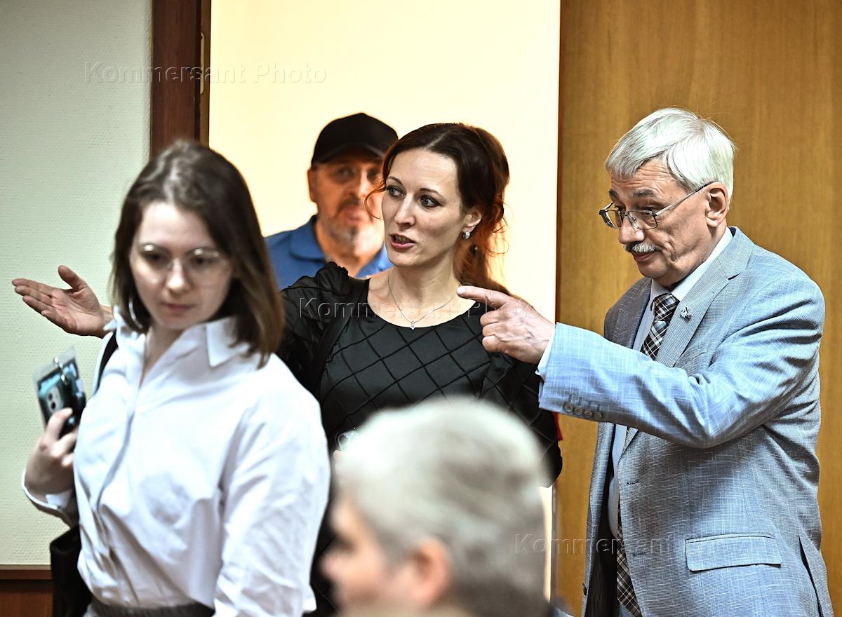 Первое заседание по делу председателя совета общества "Мемориал" (признано иностранным агентом и ликвидировано) Олега Орлова по статье о повторной дискредитации вооруженных сил России в Головинском районном суде. Журналист Дмитрий Муратов (в центре) во время заседания.