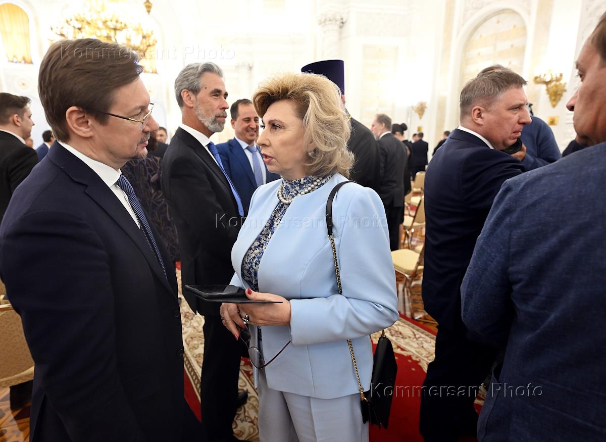 Торжественная церемония вручения золотых медалей "Герой Труда Российской Федерации" и Государственных премий в области науки и технологий, литературы и искусства, за выдающиеся достижения в гуманитарной, правозащитной и благотворительной деятельности за 2022 год, президентом России Владимиром Путиным, в День России в Георгиевском зале Большого Кремлевского дворца. Уполномоченный по правам человека в России Татьяна Москалькова (в центре) и заместитель начальника Управления президента России по общественным проектам Александр Журавский (слева) во время церемонии.