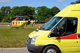 Передача пациента из медицинского вертолета бригаде скорой помощи на вертолетной площадке Петропавловской крепости. Жанровая фотография.
