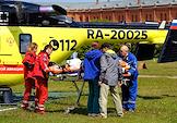 Передача пациента из медицинского вертолета бригаде скорой помощи на вертолетной площадке Петропавловской крепости. Жанровая фотография. Вертолет "Ансат-ГМСУ" национальной санитарной авиации на вертолетной площадке.