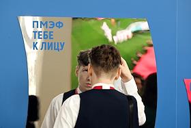 XXVI Петербургский международный экономический форум (ПМЭФ) 2023 в конгрессно-выставочном центре (КВЦ) "Экспофорум". Жанровая фотография. Павильон Российского футбольного союзда (РФС).