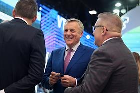 XXVI Петербургский международный экономический форум (ПМЭФ) 2023 в конгрессно-выставочном центре (КВЦ) "Экспофорум". Губернатор Самарской области Дмитрий Азаров (в центре) во время форума.
