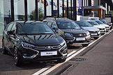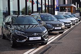 XXVI Петербургский международный экономический форум (ПМЭФ) 2023 в конгрессно-выставочном центре (КВЦ) "Экспофорум". Жанровая фотография. Автомобили бренда LADA ("Лада") АО "АВТОВАЗ" - представительский седан LADA Aura, электромобиль LADA e-Largus, компакт-кар LADA Vesta.